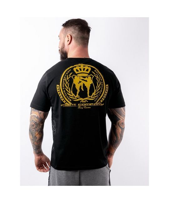 Новинка сезона! Спортивная футболка с ярким желтым принтом на черном фоне. Фирменный знак Label 23 - изображает двух сошедшихся в поединке бойцов, в круге пальмовых ветвей, увенчанных короной. Надпись под принтом "Бойцовская компания ", надпись "Бокс соединяет" по периметру принта. 95% хлопка и 5% эластана.