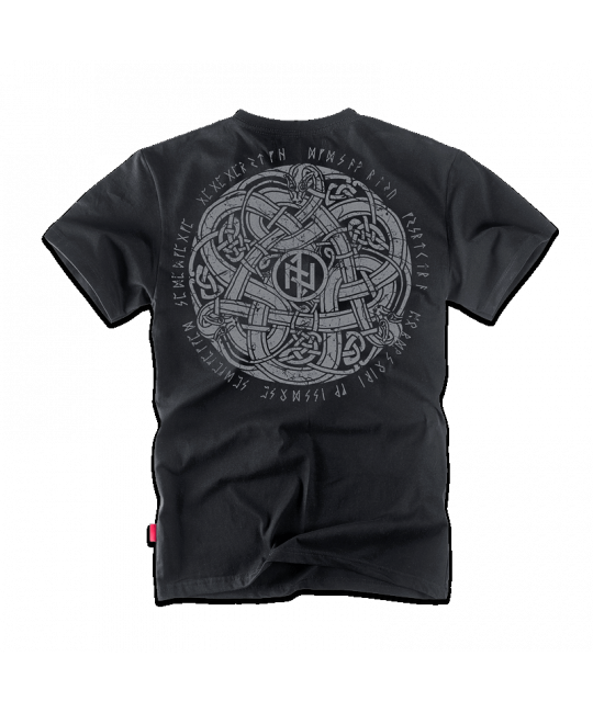 Футболка с классическим узором коллекции Celtic. Скандинавская стилистика, рисунок, представляющий кельтские сплетения и рунические знаки. Одноцветный принт, с заметным эффектом трещин, повторенный спереди и сзади футболки в разных размерах. Хлопчатобумажная, высококачественная мужская футболка с коротким рукавом. При шее трикотажная резинка и внутренняя обшивка красного цвета, сбоку лейбл с лого марки.