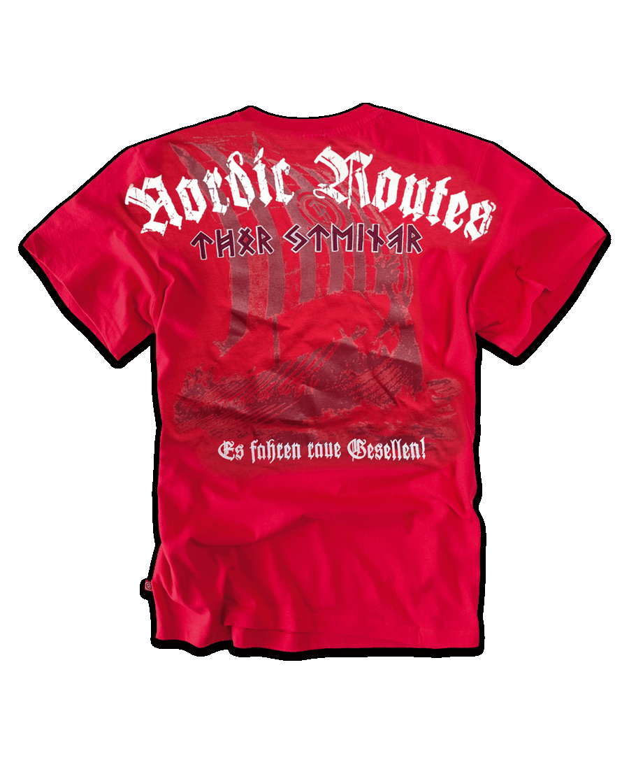 Мужская футболка Raue Gesellen от Thor Steinar свободного покроя из хорошего качественного хлопка. В области шеи, с внутренней стороны, для большего комфорта, проходит бархатный кант. На спине футболка оформлена художественным мотивом - плывущий дракар викингов. Эффектная комбинация принта с вышивкой. На груди небольшой принт- голова викинга с надписью Thor Steinar , Viking company. 100% Хлопок.