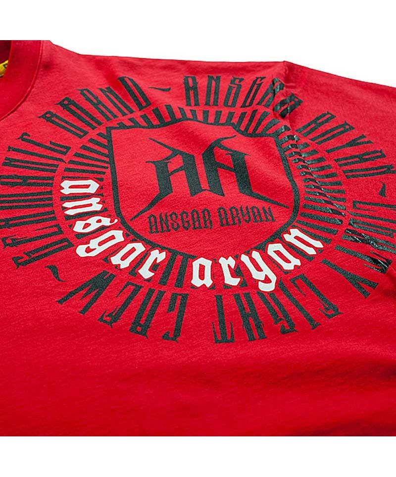 Мужская футболка свободного кроя с короткими рукавами ярко-красного цвета SHIELD Ansgar Aryan сшита из мягкого качественного хлопка. Передняя часть оформлена большим круглым принтом, переходящим с груди на предплечье. На левом рукаве прошит логотип изделия на золотом фоне и такая же цветовая полоска оформляет внутреннюю часть круглого воротника, прошитого эластичной резинкой. С внутренней стороны спинки изделия имеется небольшая, тематическая вышивка. Свободные рукава не стесняют движения, позволяя своему владельцу вести активный образ жизни без малейшего дискомфорта и ограничений.