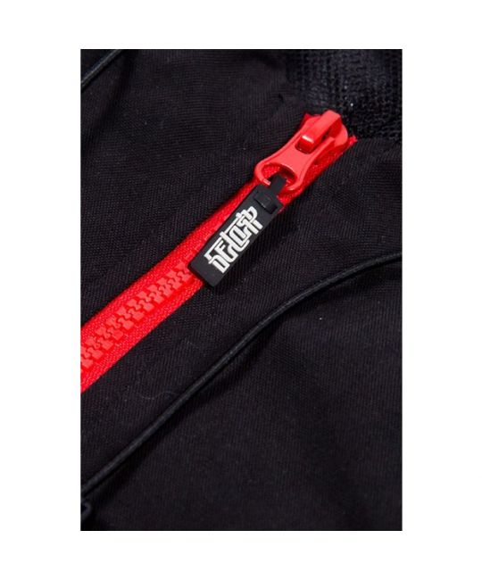 Куртка-анорак из мембранной ткани черного цвета. Два больших накладных кармана на груди, два врезных по бокам. Декорирован шевроном с логотипом. Контрастные молнии. Удлиненная фронтальная молния. Регулируемые утяжки на поясе и в капюшоне. Анатомический капюшон с козырьком. Подкладка-сетка. Манжеты на липучках. Сезонность (Весна-Лето-Осень)