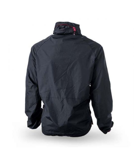 Мужская демисезонная куртка Fyn Thor Steinar в стиле анорака выполнена в черном тоне со вставками розового цвета и одевается через голову. В области шеи имеется небольшая застежка-молния, внутри которой находится розовая защитная вставка с вышивкой. На левой груди вшит внутренний объемный карман, а по бокам снизу имеются два небольших кармашка. Все карманы застегиваются на молнию. Манжеты и низ изделия прошиты плотной резинкой. На воротнике имеется потайной отдел на молнии, где спрятан воротник.