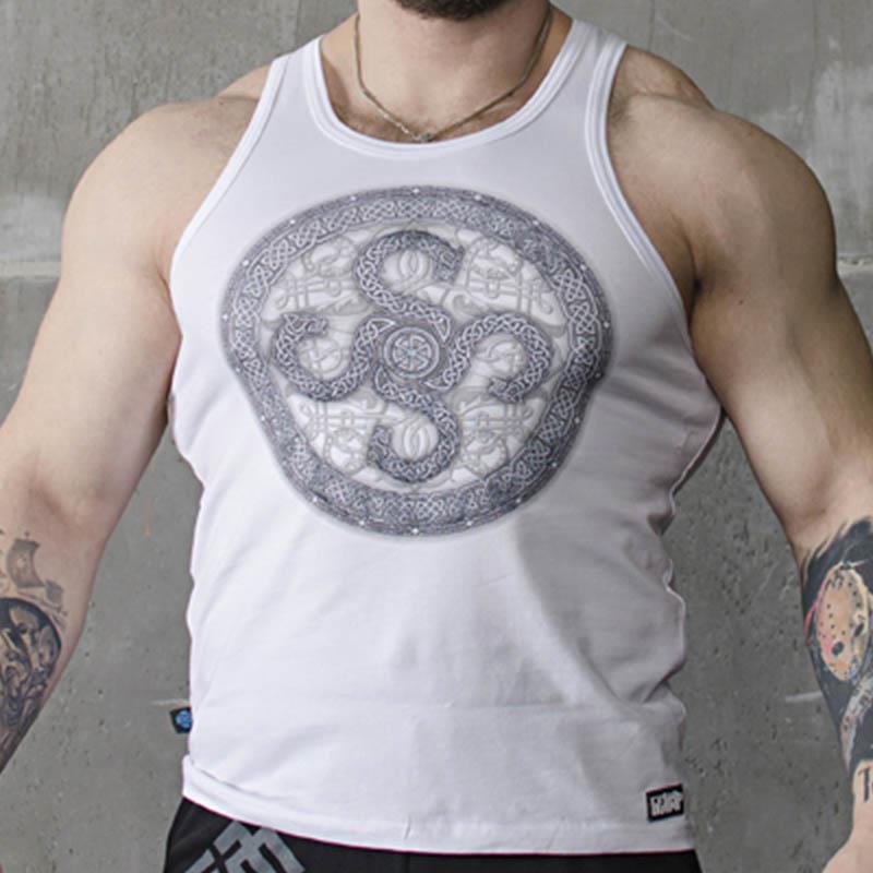 Мужская майка-борцовка "Ярга" от Белояр, отлично подчёркивает фигуру и удобна в носке. На груди художественный принт в виде солярного символа русов - ярги (крест с загнутыми концами). Символ ярги бытовал у наших предков с зари исторического развития человечества. Самые ранние археологические находки на территории Малороссии датируют XVIII-XIII тысячелетием до нашей эры.