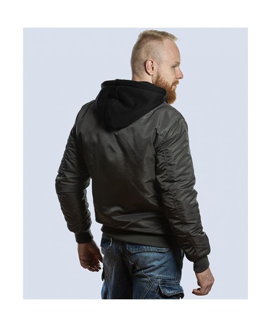 Мужской бомбер со стеганным подкладом и двойным хлопковым капюшоном. Капюшон не снимается. Классическая модель MA-1. Карманы утеплены флисом.