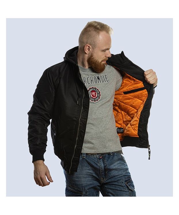 Мужской бомбер со стеганным подкладом и двойным хлопковым капюшоном. Капюшон не снимается. Классическая модель MA-1 . Карманы утеплены флисом. На груди фирменный сьемный патч.
