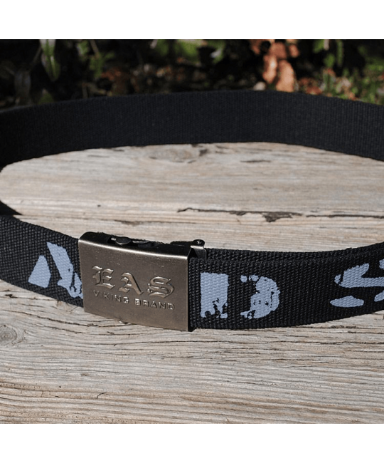 Мужской ремень из прочного материала чёрного цвета с металлической прямоугольной пряжкой.Изделие декорировано печатным принтом по всей длине ремня. Длина - 135 см, ширина - 4,2 см.