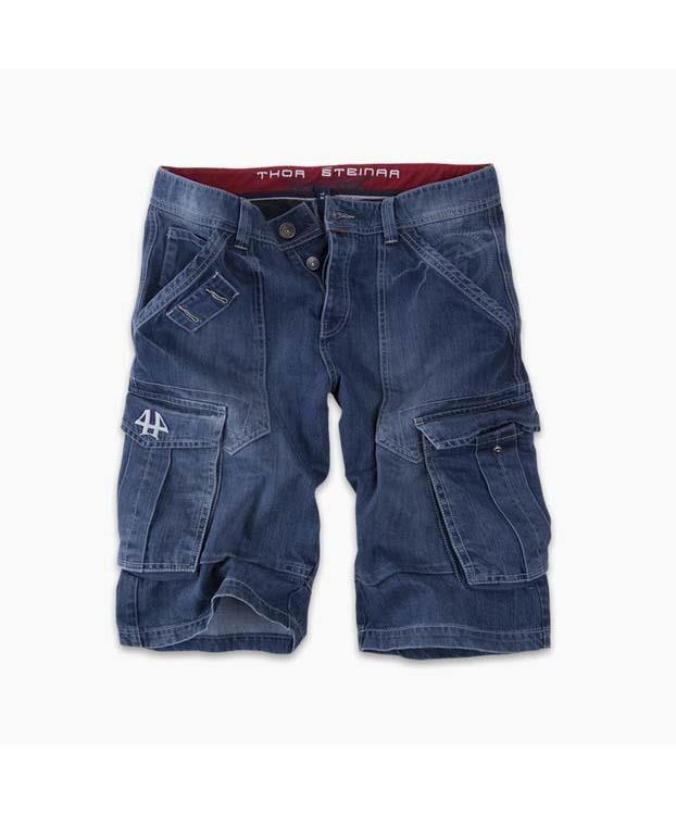 Мужские шорты-карго от Thor Steinar Tronder, из прочной джинсовой ткани. Большие передние карманы, декорированные контрастными швами. Большие боковые и задние карманы закрываются на кнопки. Объёмная вышивка на правом боковом кармане, принт-логотип на переднем кармане. Пояс с внутренней стороны усилен тканью контрастного цвета с принтом. Состав: 100% хлопок.