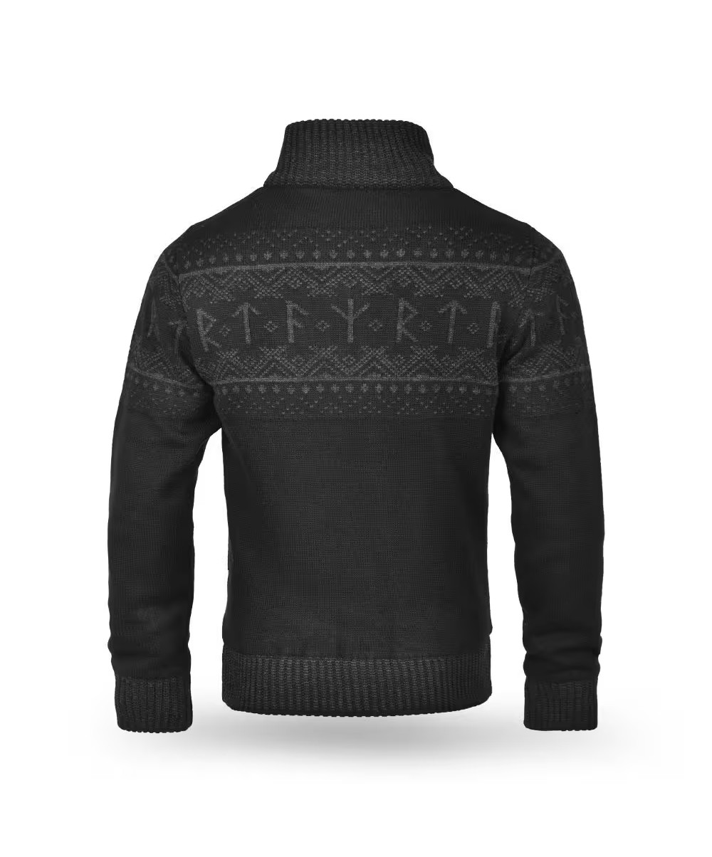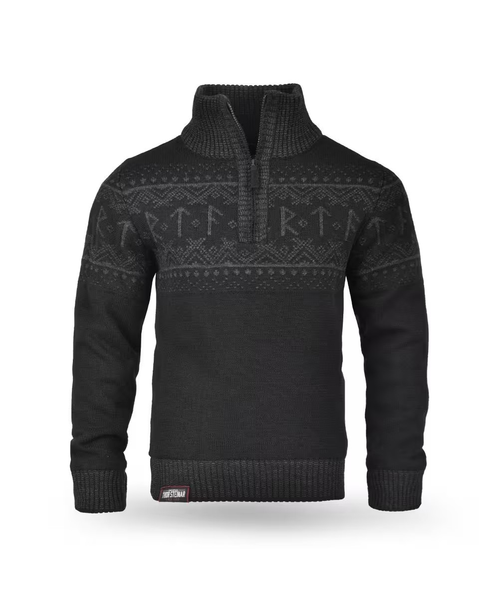 Мужской свитер “Runa schwarz” с высоким воротом на молнии. Очень тёплый свитер в скандинавском стиле, с непродуваемой подкладкой, с двойными манжетами, низом и воротом. Руническая вышивка на груди и спине. Фирменный ярлык в боковом шве. Свитер отлично впишется в Ваш гардероб и будет гармонично сочетаться с брюками и джинсами. Прекрасный вариант для осенне-зимнего периода.