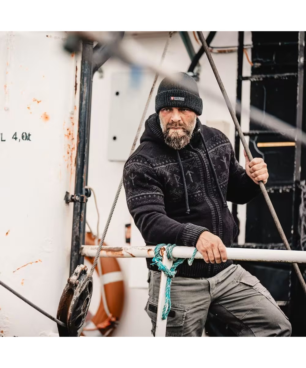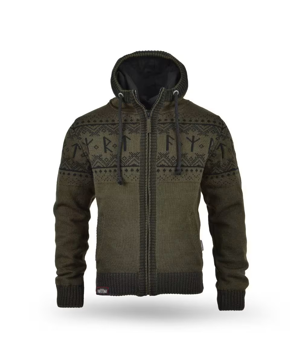 Мужской свитер-куртка "Runa" с капюшоном. Очень теплый свитер-куртка в скандинавском стиле, с подкладкой. Застёжка на замке-молнии, высокий воротник стойка, два боковых кармана, манжеты и низ свитера из прочного трикотажа. Фирменный ярлык в боковом шве.