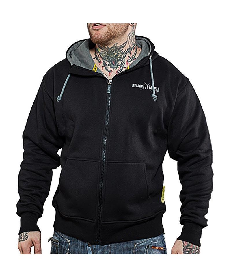 Теплая мужская толстовка ELITE Ansgar Aryan выполнена в двуцветной гамме: черный верх и подкладка серого цвета. Модель застегивается на молнию, которая переходит в высокий воротник, а капюшон регулируется кулисками на необходимую длину. Манжеты и нижняя часть дополнены мягкими и очень плотными трикотажными вставками. Спереди толстовка оформлена небольшой текстовой вышивкой, которая дублируется большим принтом на спине и вместительными накладными карманами. Изделие изготовлено из мягкого натурального хлопка, отлично выдерживающего многократные стирки без потери своих потребительских качеств.