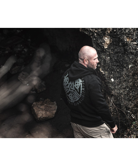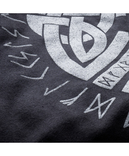 Изготовлена из высококачественного хлопка, имеет два передних кармана, отделанных лентами. На левом рукаве небольшая этикетка с логотипом бренда. Капюшон украшен толстым шнуром и фурнитурой с логотипом бренда. На передней части толстовки — небольшая вышитая нашивка с скандинавским символом. Спинка толстовки украшена крупным графическим изображением в скандинавском стиле, выполненным выпуклой печатью.