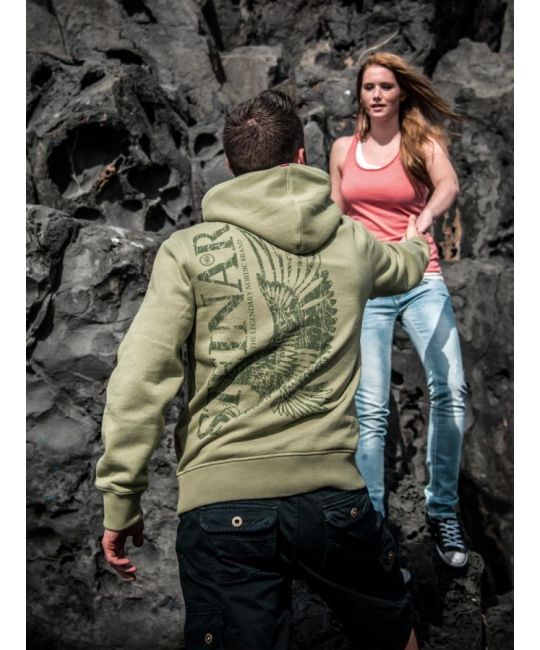 Мужская толстовка Oern от Thor Steinar, пошитая из мягкого хлопка и полиэстера. Многослойный капюшон из вафельного материала с контрастного цвета подкладом. Спереди толстовка закрывается на молнию и имеет два боковых кармана в стиле кенгуру. Манжеты, нижняя часть и края карманов сделаны из эластичной ткани. На спине объёмный принт- мотив расправившего крылья орла, спереди в области плеча вышито название бренда. Материал: 70% хлопок, 30% полиэстер.